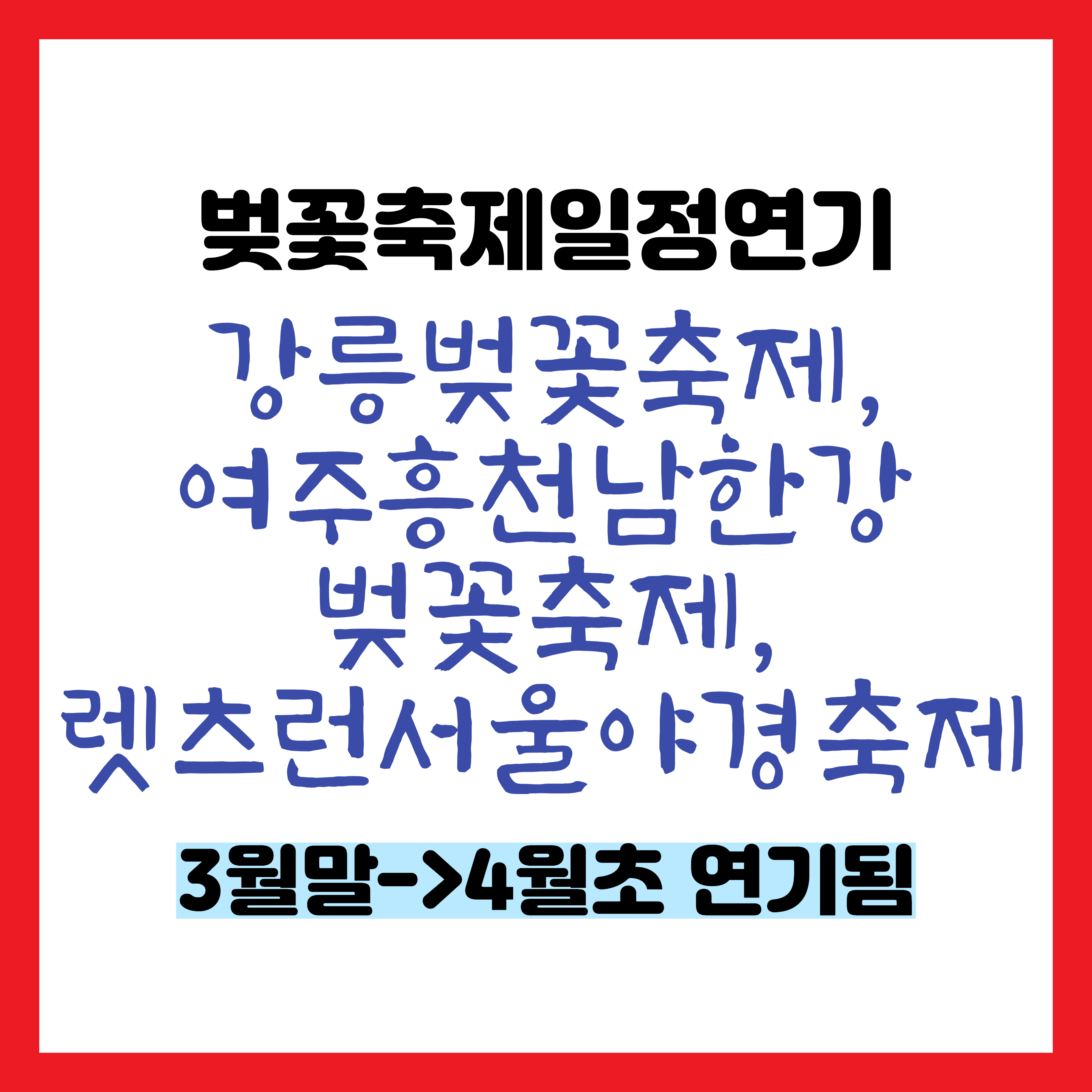 강릉에도 현재 벚꽃이 개화하지 않아서 벚꽃 축제 예정일이 일주일 연기되었습니다. 강릉경포대, 경포호수 및 습지광장 일원에서 진행되는 강릉벚꽃축제 변경된 일정에 맞춰서 방문해보시면 좋겠습니다.