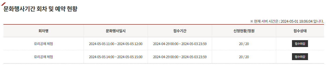 하지만 혹시 5월 3일 이전에 취소표가 있다면 접수가 가능하기 때문에 꼭 원하신다면 수시로 접수예약가능 여부를 확인해 보시면 취소표의 기회가 있을 수 있을 것 같습니다.