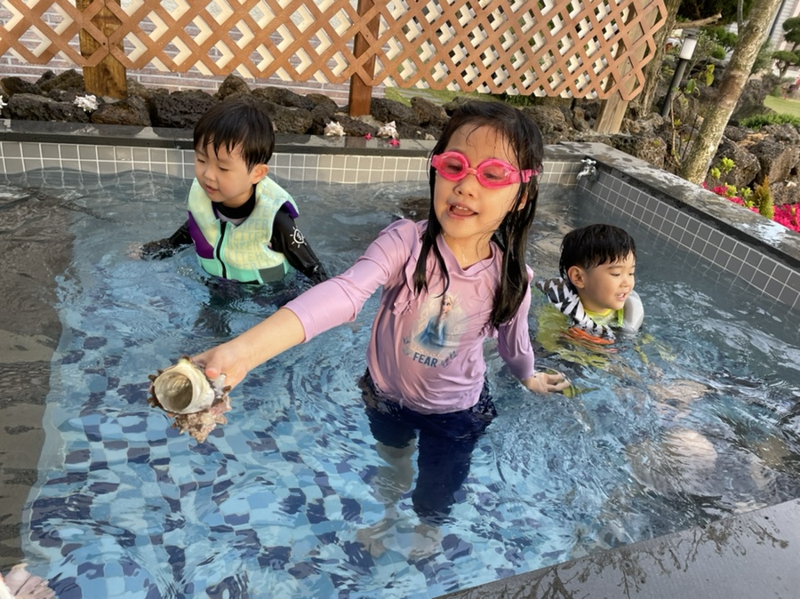 수영을 다들 좋아하는 아이들이라 수영을 안할수는 없어서 자쿠지 수영장에 온수풀을 예약했습니다.