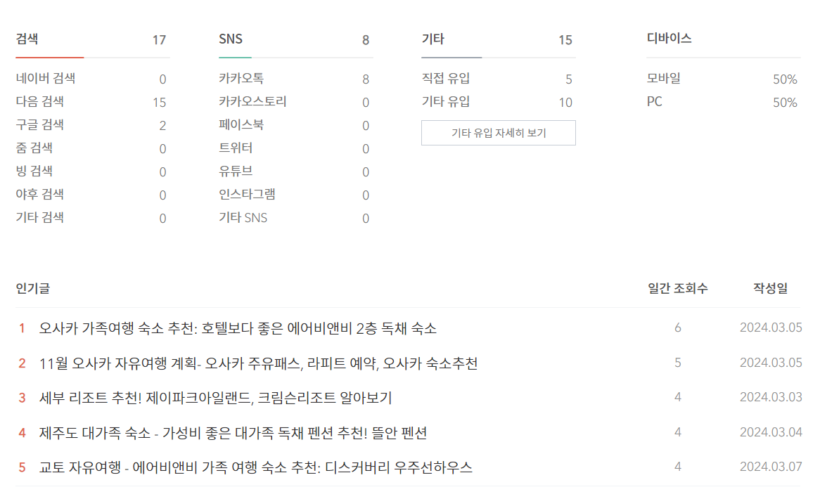 여기서 기타 유입 자세히 보기를 눌러보시거나 유입 경로 메뉴를 통해서 누가 어떤 검색으로 내 블로그에 유입되었는지를 확인할 수 있습니다. 유입이 많은 글이 잘 쓰거나 키워드가 좋은 글이겠죠.