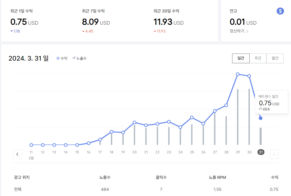 처음에는 노출이 워낙 적었고, 새로운 사용자가 접속해서 들어오는 인원이 5명? 이정도여서.. 하루에 0.1 달러도 힘들었습니다.
